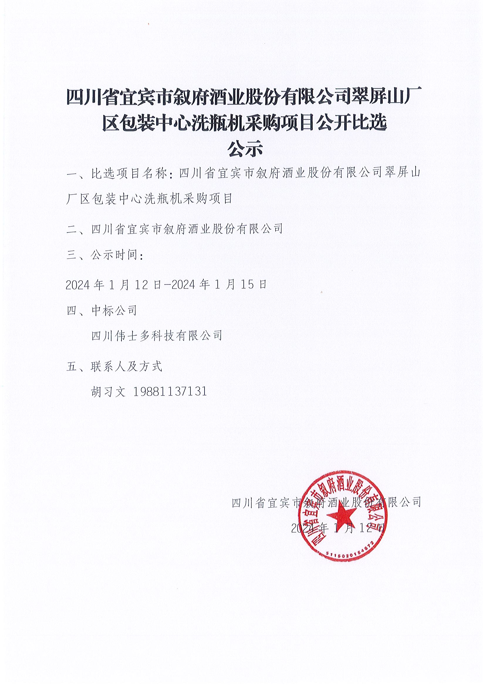 四川省宜賓市敘府酒業(yè)股份有限公司 2024年春季糖酒會(成都泰合國際大飯店)場地租賃中標結果公示公告