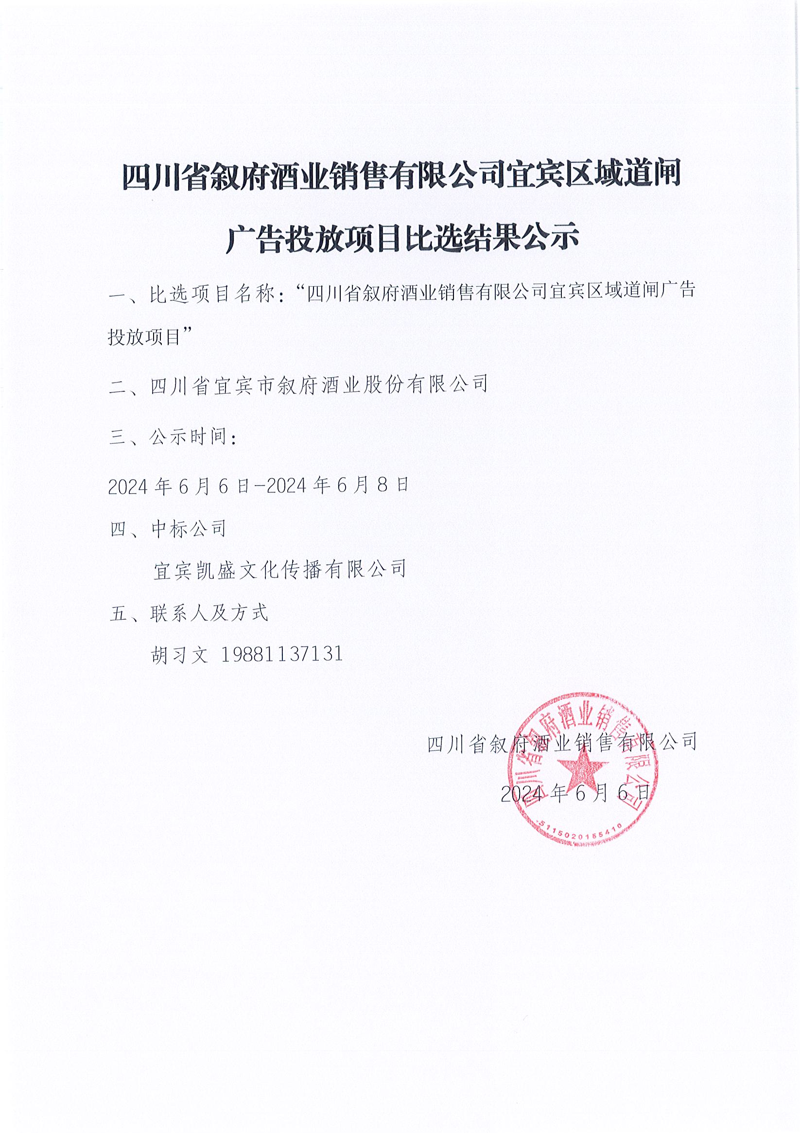 四川省敘府酒業(yè)銷售有限公司2024年第一階段廣告投放項(xiàng)目單一來源采購公示公告