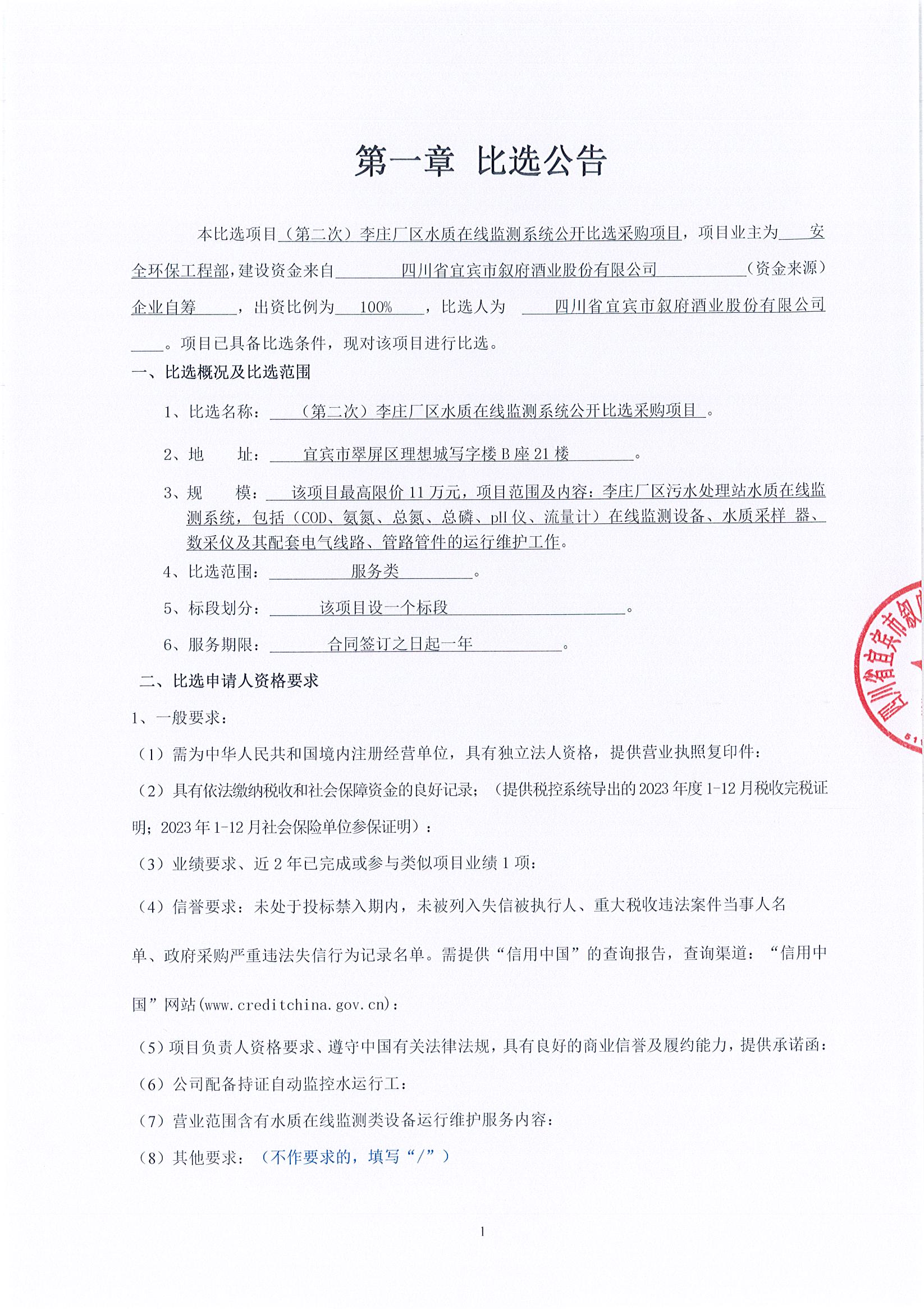 四川省宜賓市敘府酒業(yè)股份有限公司李莊廠區(qū)水質(zhì)在線監(jiān)測系統(tǒng)公開比選采購項目流標(biāo)公示公告
