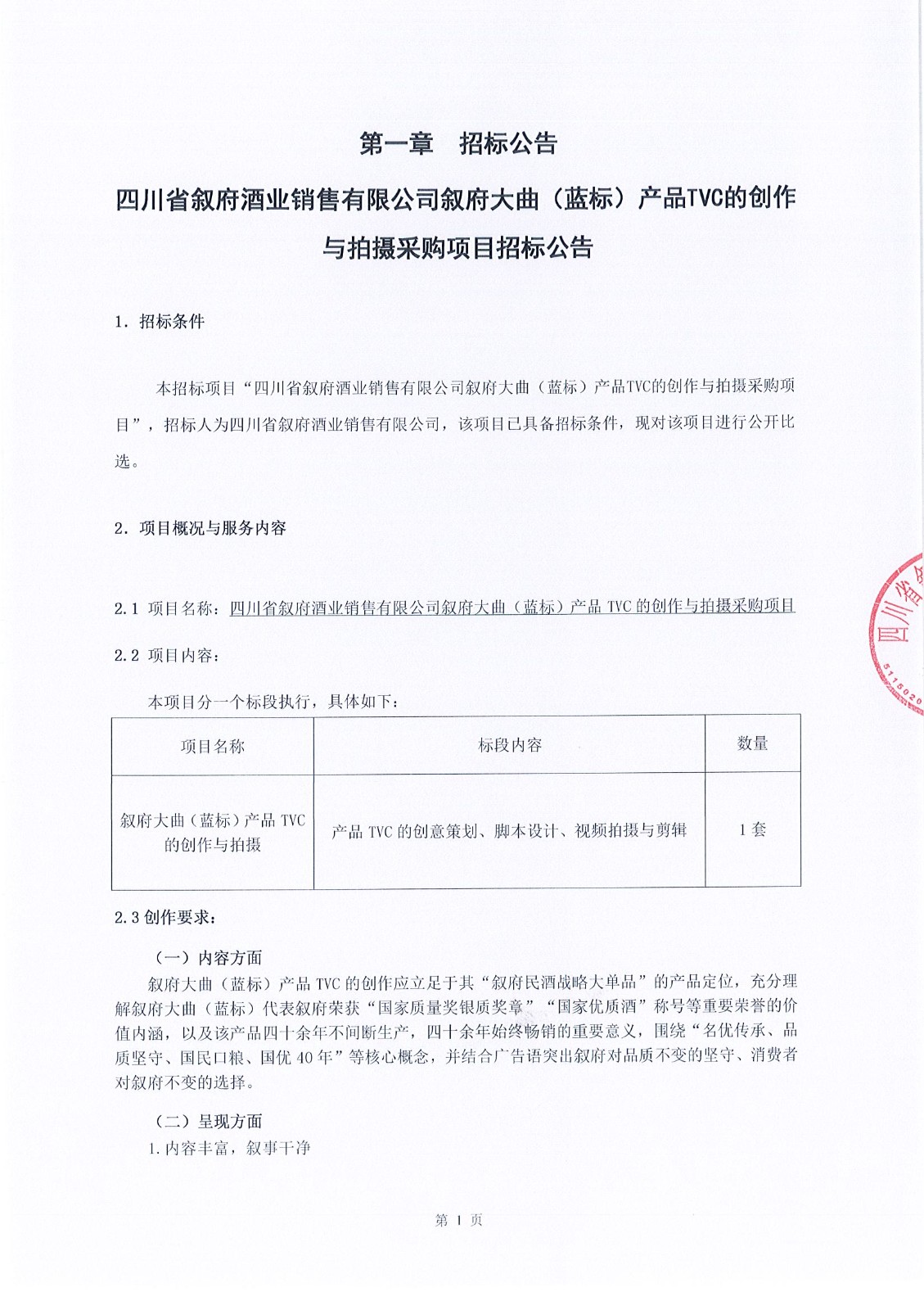 四川省敘府酒業(yè)銷售有限公司敘府大曲(藍(lán)標(biāo))產(chǎn)品TVC的創(chuàng)作與拍攝采購(gòu)項(xiàng)目中標(biāo)結(jié)果公示公告
