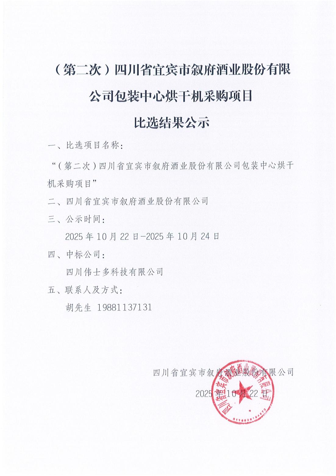 四川省宜賓市敘府酒業(yè)股份有限公司包裝中心烘干機(jī)采購(gòu)項(xiàng)目比選招標(biāo)公示公告
